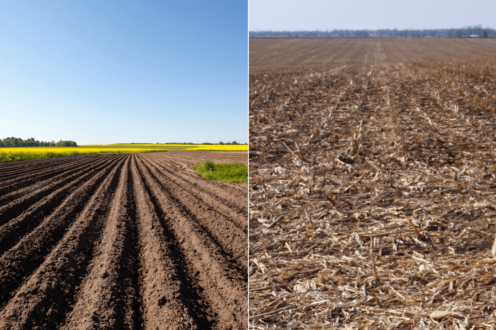 Tillage refers to turning or mixing of the soil. In the last several decades, the majority of farmers have practiced conventional tillage, which requires using a plow and additional tillage equipment to completely overturn the soil, creating a nice, fluffy soil bed that warms quickly and is easy to plant into. Conventional tillage is what you generally see when you look at glossy agricultural marketing materials, with the field plowed in neat rows of dark soil.