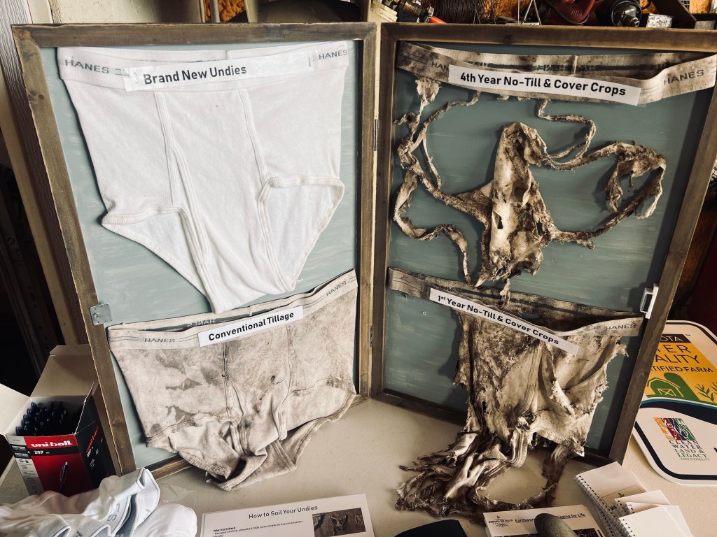 My favorite part of the field day, aside from getting to know and chat with some of our local farmers, was learning about a more unique soil health demonstration. Mark Gutierrez, Executive Director at the Minnesota Soil Health Coalition, brought an interesting foldable display that when opened and set up, showed the various tattered remains of four different pairs of men’s cotton briefs.