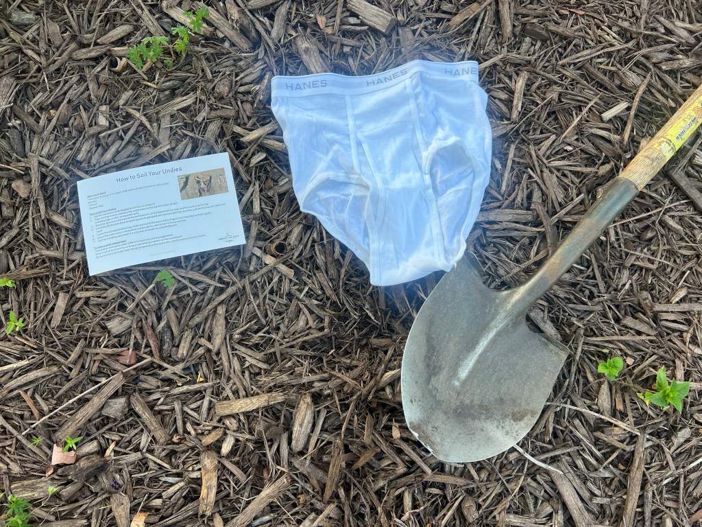 There just happened to be some extra new briefs lying around the demo, so I thought, why not? Let’s see how the soil microbes are doing in my little home garden. I came home, and buried some underwear. See you in 60 days, undies!