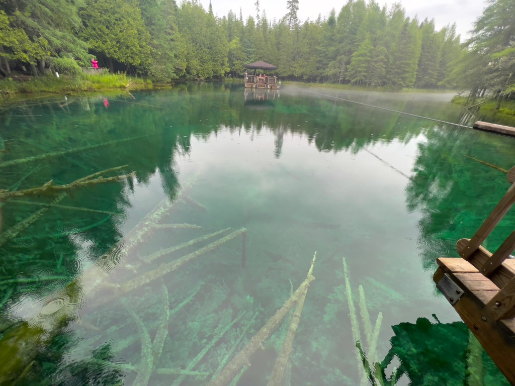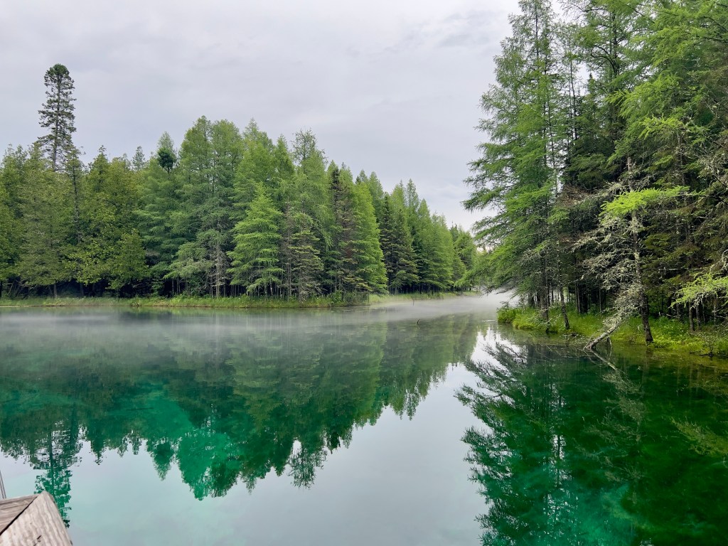 Yet, the place that caught me the most in that water-rich landscape, even with the frequent beauty and majesty of the Great Lakes, was actually a groundwater spring named Kitch-iti-kipi (kitsch-itty-kipee) located in Palms Book State Park near Manistique, Michigan. We were en route between camping spots, hauling our travel trailer, and our decision to go there was somewhat spontaneous. I had heard of the spring, but knew it likely would be a short activity and perhaps of more interest to me rather than my husband and two daughters. Still, it was a spot to stretch our legs, we already had a permit for the MI state park system, so why not stop?