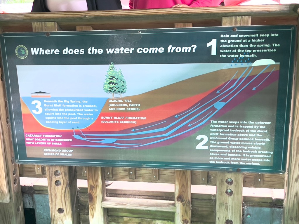 The raft has an O-shape to it, with an open center so you can look down into the depths of the spring, and to my surprise, I suddenly noticed how the sand at the bottom of the spring appeared to boiling and dancing about. A quick glance at one of the sign placards on the raft quickly zoned in on why: the bedrock was fractured limestone, and the groundwater in that limestone was under pressure, leading it to discharge more than 10,000 gallons per MINUTE into the spring. In the 20 minutes that we floated over the spring and back, two hundred thousand gallons had entered what appeared to be this still quiet spring, with the outlet of the spring to nearby Indian Lake.