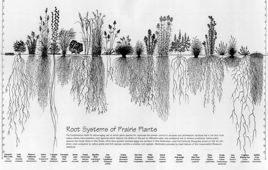 Here in Minnesota, the lawn of choice is generally a species called Kentucky bluegrass. It’s a cool-season grass native to Europe and Asia, meaning that it grows best in the cooler seasons but also recovers well after a cold winter. The root system for Kentucky bluegrass though, is something to be desired: it extends only 4-8 inches into the soil.