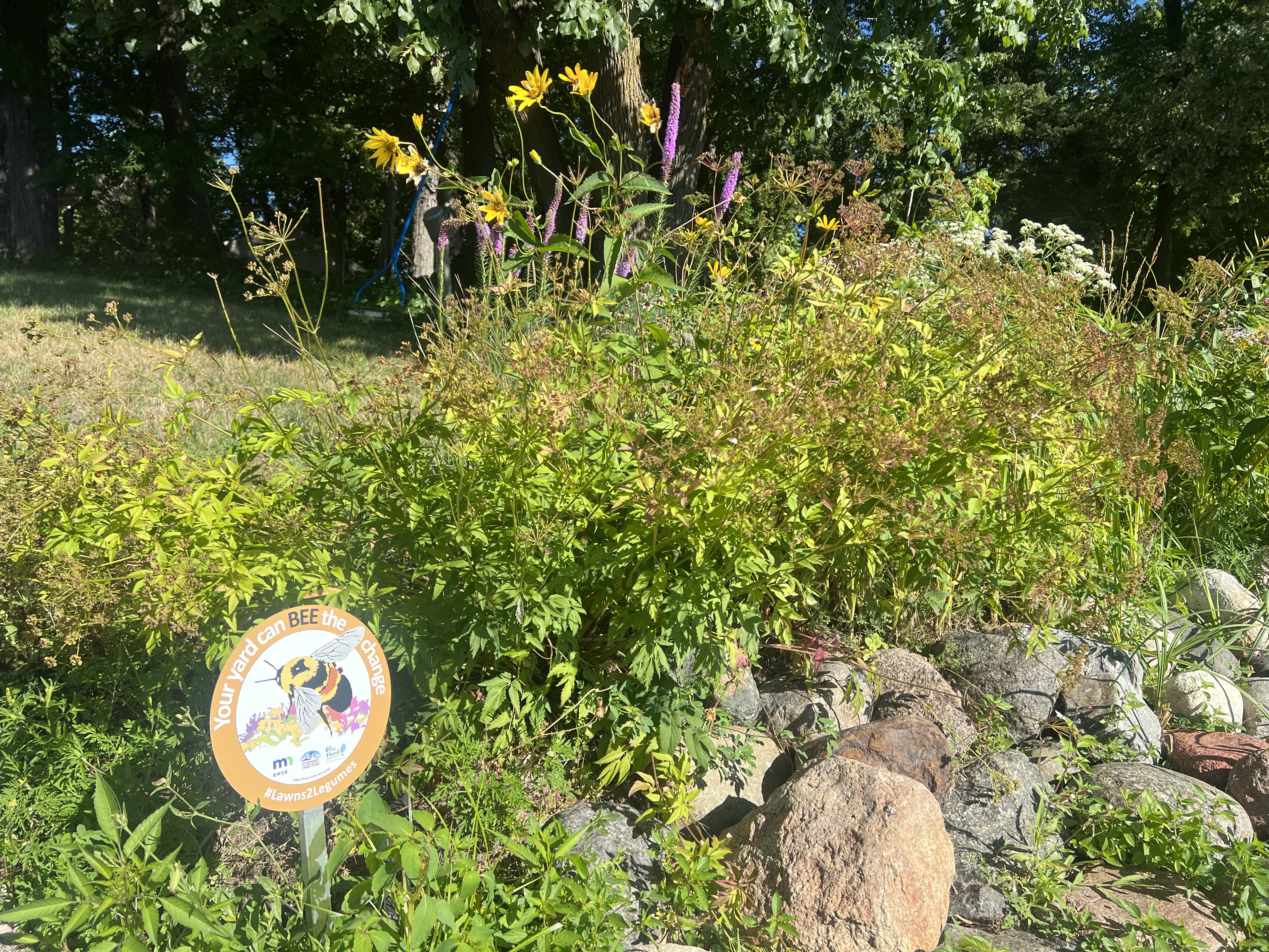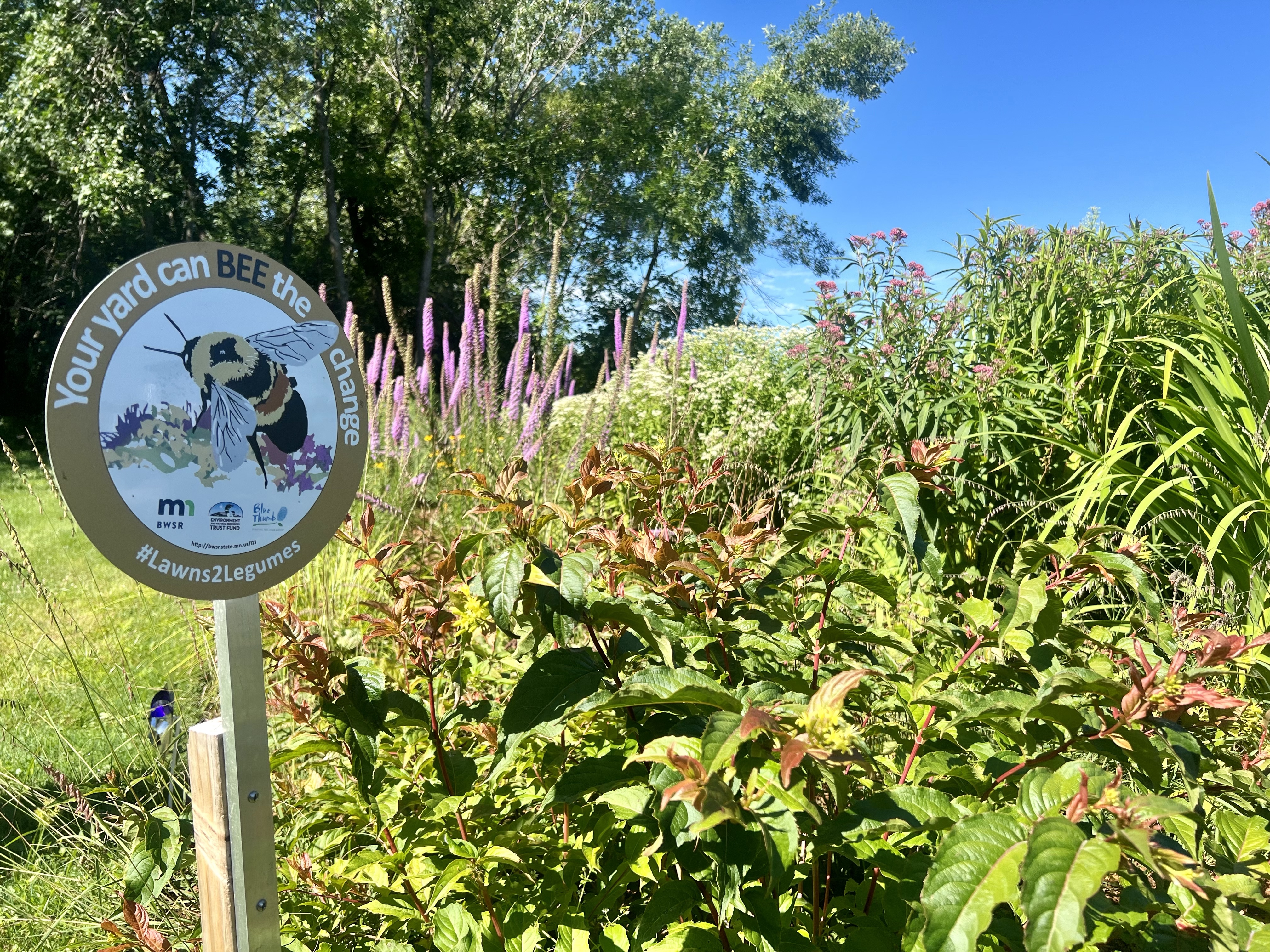 Mickey Carlson on Kroon Lake doesn’t have a large amount of bees or blossoms just yet on her shoreline – her native shoreline buffer was planted last fall and the plants are still only inches tall. That hasn’t deterred her from hanging her “Please excuse the weeds, we’re feeding the bees” sign in her garden.