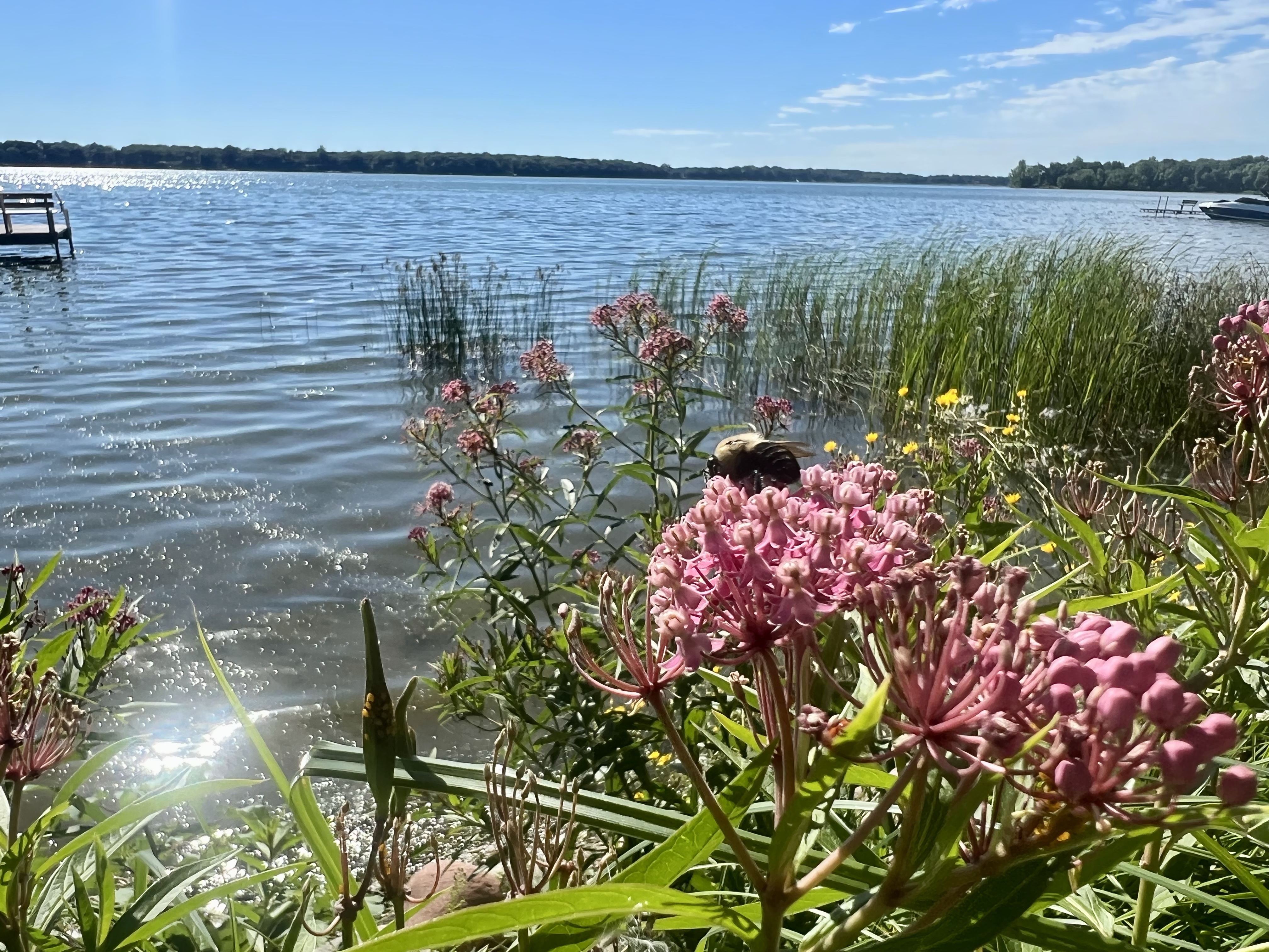 “When we first moved into our house three years ago, the shoreline was all invasive honeysuckle and buckthorn. We wanted a native, natural landscape with lots of pollinator habitat,” says Scott.