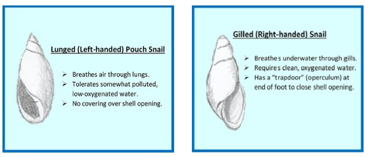 In our quick grab samples from Forest Lake, one of the most obvious specimens we collected were several large empty snail shells. Given that the shells float when its occupant passes away, they are easy to see and fun to grab. What’s not as obvious however, is that one can determine what type of snail you have based on whether the shell opening points to the left or the right. If the opening points to the left, you have a pouch snail that breathes air through its lungs. If you have a shell whose opening points to the right, you have a gilled snail that uses gills to breathe underwater.