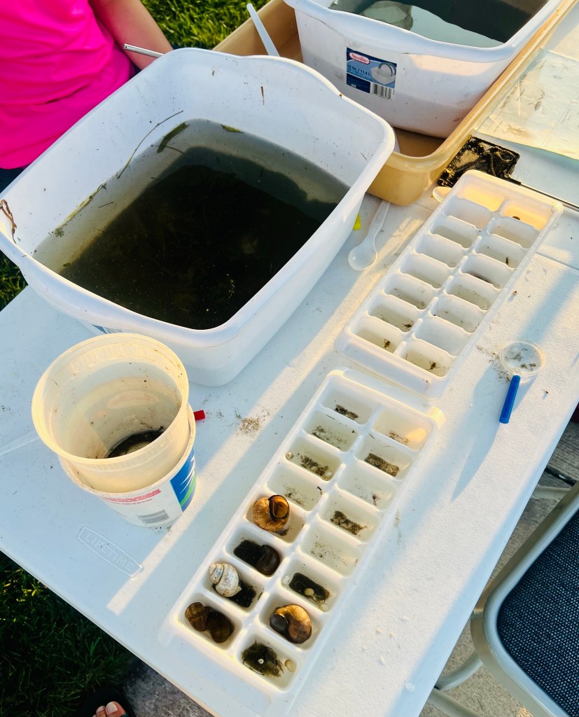 Armed with a few plastic tubs and a kick net, my daughters and I dredged a couple areas near the shoreline among the shoreline vegetation trying to find water bugs. While initially the water was too cloudy to see anything, a few minutes later the aquatic macroinvertebrates revealed themselves dashing through the water as the sediment settled in the tubs. We quickly grabbed our plastic spoons and started scooping up little creatures into sections of an ice cube tray for further viewing and study for those at the park.