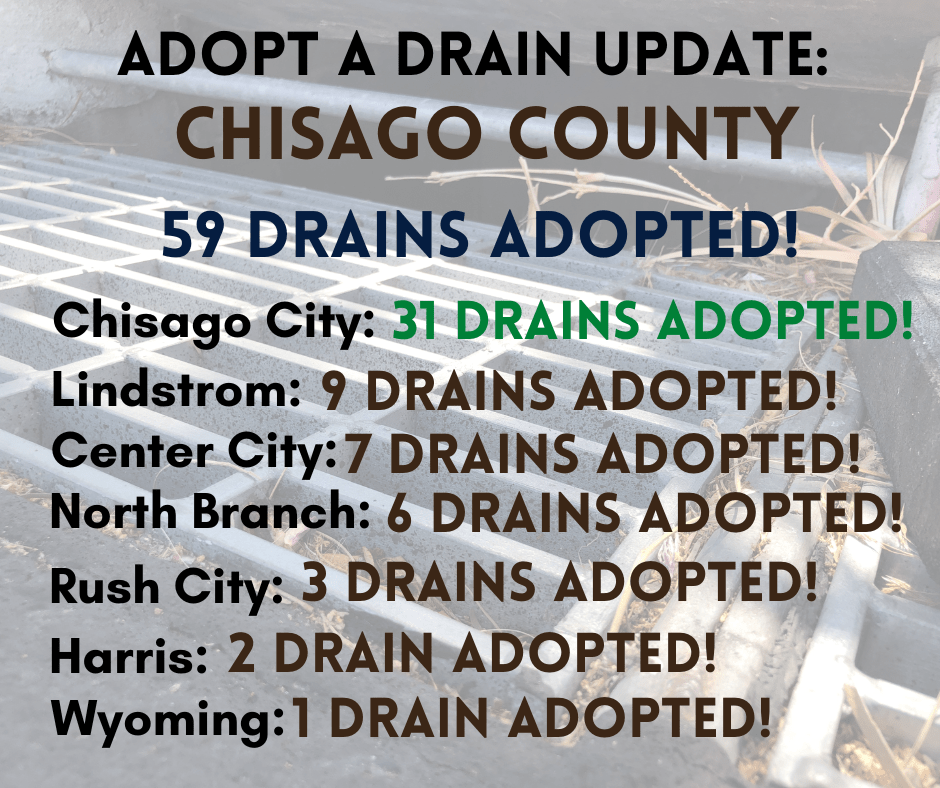 Since joining the Adopt-a-Drain program in May, 59 drains have been adopted across Chisago County. Drain adopters have already prevented over 175 pounds of leaves, dirt, and debris from entering their storm drains just over the summer. With the Walky-Talky group adopting 17 of those 59, Chisago City thus far is running away with the count across Chisago county communities.