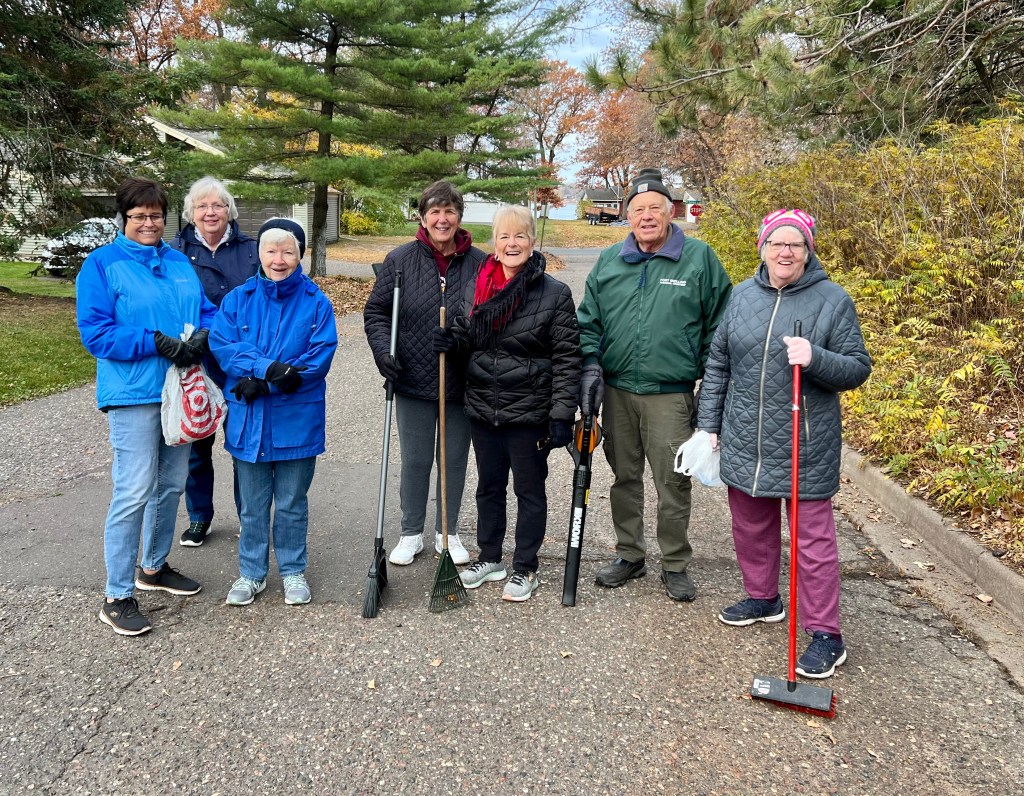 Hats and gloves were definitely needed because of the chilly weather, but this group also has a few more surprising accessories in hand: brooms, rakes, a leaf blower, and garbage bags.
