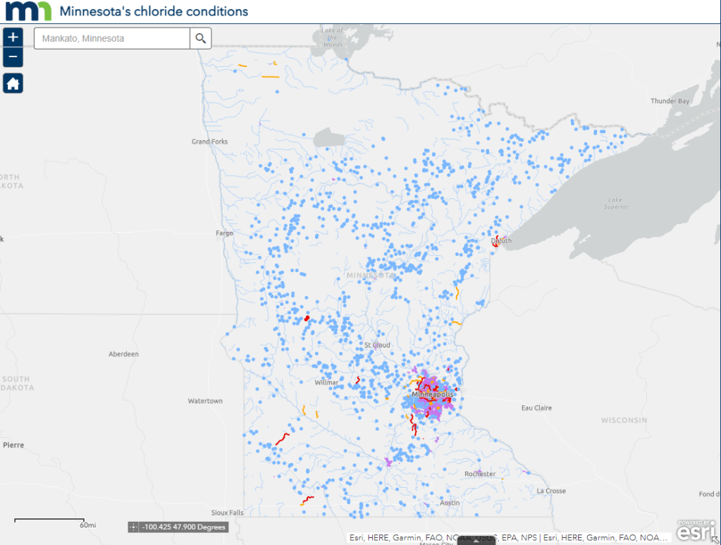 But then, I started learning about salt’s cost to our environment – our salt use is leading to chloride levels in our rivers and streams that are considered dangerous for aquatic life. On average, the Twin Cities uses 365,000 tons of road salt each year, and a study by the University of Minnesota showed that up to 78% of that salt travels and remains in our groundwater and local rivers, lakes, and wetlands. In recent years, studies have shown that over 20% of monitoring wells in the Twin Cities metro area have chloride levels that exceed the EPA drinking water guidelines. Fifty-four Minnesota lakes and streams have chloride levels too high to meet the standard designed to protect fish and other aquatic life (and another 75 lakes and streams are close to also exceeding that standard).