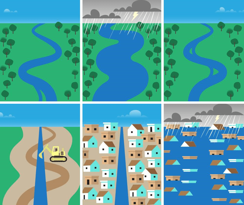 What’s the point? Sometimes we engineer ourselves into problems when we don’t pay attention to the landscape. Our tendency to cover areas with impervious surfaces and restrict the movement of our rivers and lakes works against us, and it prevents nature from doing a lot of the hard work of infiltrating, moving, and storing water for us. We need to work more with natural systems versus against them.