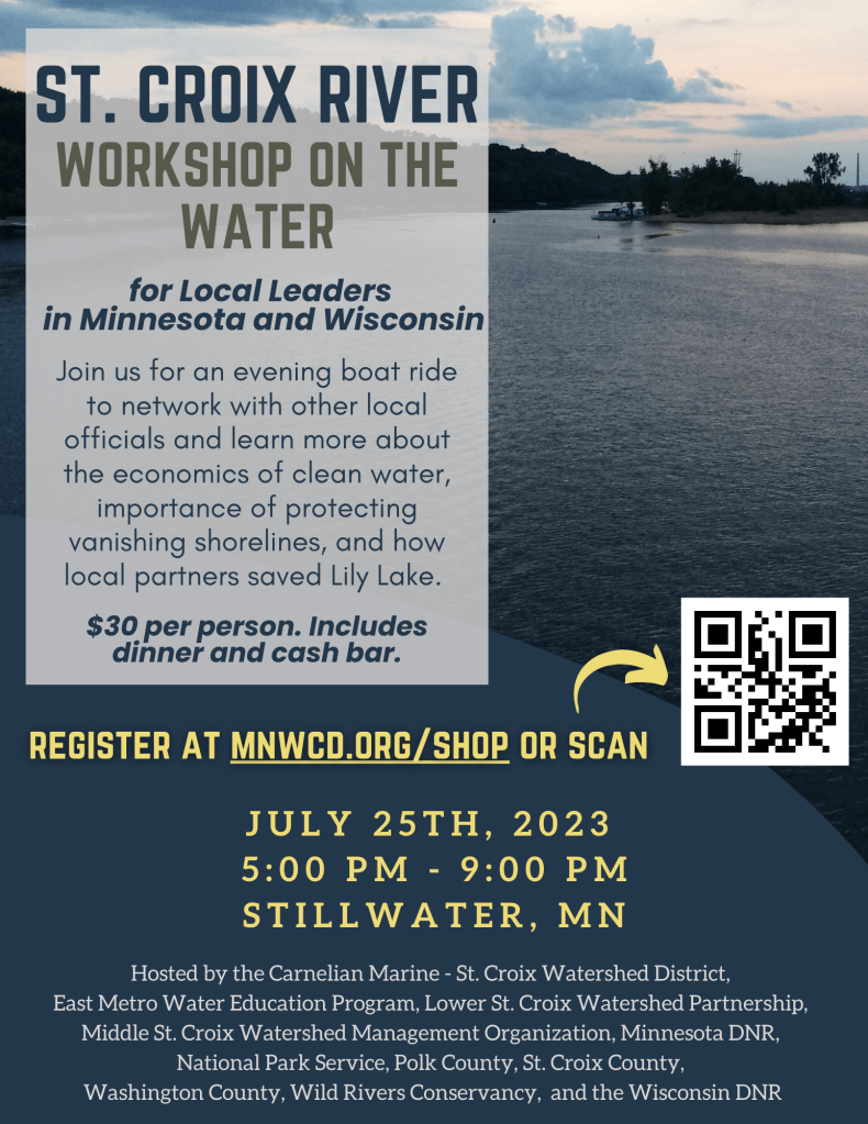 We have another opportunity next month to attend our Workshop on the Water – this time out of Stillwater! If you are a local decision maker for your community, we would love to have you. You can learn more and register at www.mnwcd.org/shop.