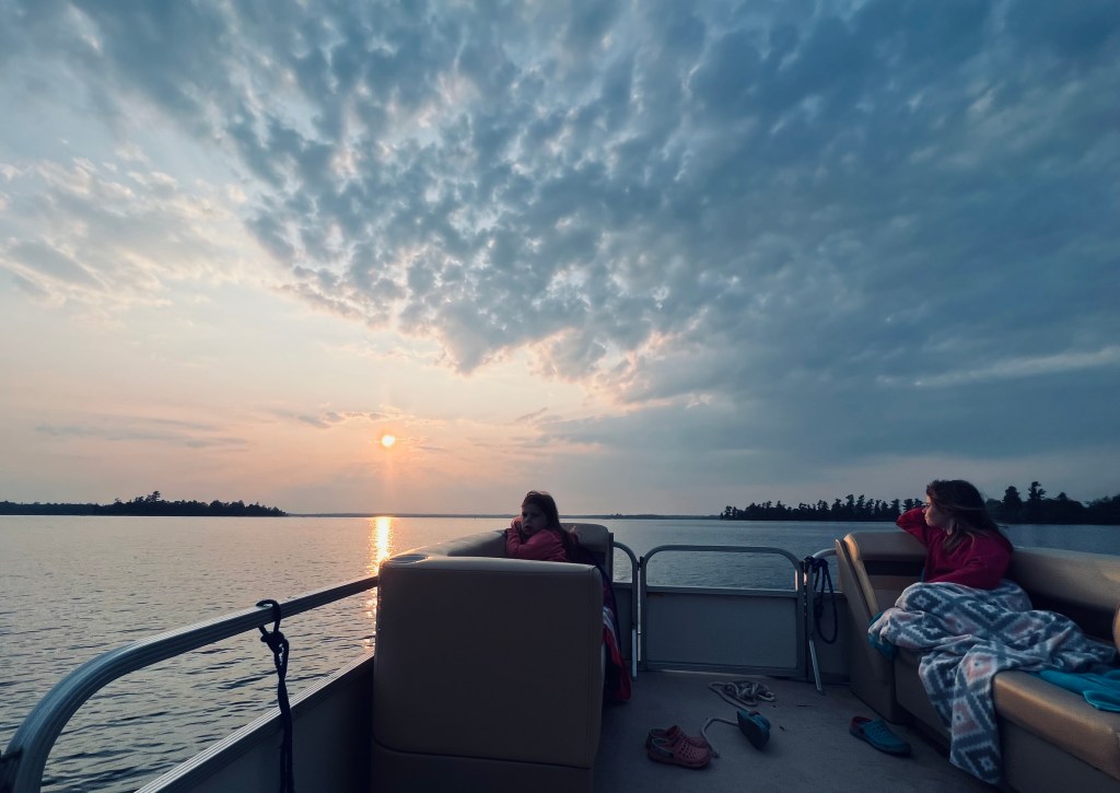 When I looked to the horizon, I couldn’t see where the sky ended and the water began. I heard the distant roar of a boat engine behind us, but the water in front of us was smooth glass interrupted only by small wind ripples. As the sun continued to slide downward, softly closing out the day, all was quiet. I looked to the front of our rented pontoon to see my two daughters curled up in blankets, chins lifted to the sky, silently caught in the spell of calm beauty around us. I sighed quietly, letting my heart fill.