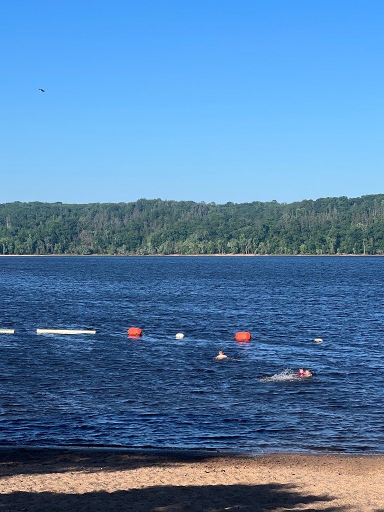 Fast forward three days later. After getting home from our camping trip up north, the girls and I were sticky with sweat from helping Dad unload our camper. Instead of turning on our sprinklers, however, we decided to head to our nearby St. Croix River swimming beach at Lakeside Park in Bayport to cool off. We arrived to find it almost abandoned – the heat of the day had passed and most families had moved upland to the playground and picnic tables. My girls eagerly plowed right into the water. Just as I made myself comfortable, suddenly I noticed a bald eagle swooping slowly over the river. A squeal of excitement from the water informed me the girls had also spotted it, and I could see them lift their arms in the water, mimicking the slow, strong pulse of the eagle’s wings.