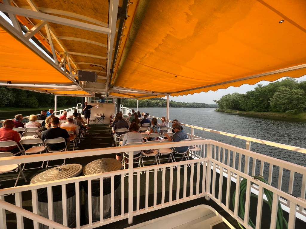 Fast forward another week. Now I’m on a paddleboat – the Taylors Falls Princess – in the middle of the St. Croix River with about a hundred people, slowly passing tall cliffs of basalt. The air is hot but the breeze is comfortably cool. Blue herons cross my line of view, their reflection whizzing across the sparkling water as they beeline for the protection of shady shores.