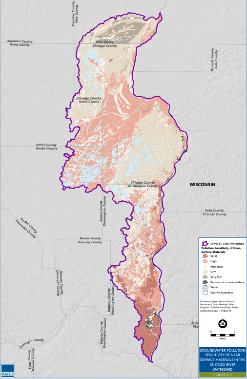 For instance, in the Lower St. Croix watershed, we have several areas that have greater ‘sensitivity’ to groundwater pollution due to the ability of water-borne contaminants to move quickly (hours to weeks) from the land surface to our groundwater aquifers.